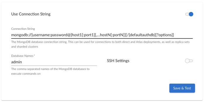 A MongoDB connection URI is a universal connection method and can be used to connect to any type of MongoDB deployment: standalone, atlas, replica set, or a sharded cluster. If using a connection string, all other MongoDB related credential fields will be ignored. The SSH settings will still be used if enabled.