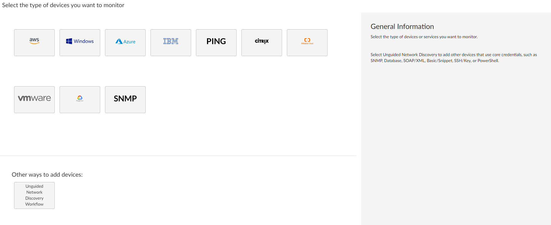 1. Click the Unguided Network Discovery Workflow button. Additional information about the requirements for discovery appears in the General Information pane to the right.