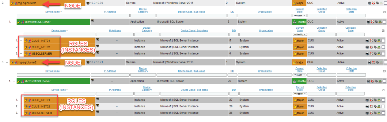 When discovering clustered SQL Server instances you will see multiple component device trees that represent the clustered SQL server. In these component device trees, the SQL servers are described as Nodes and the instances described as Roles.