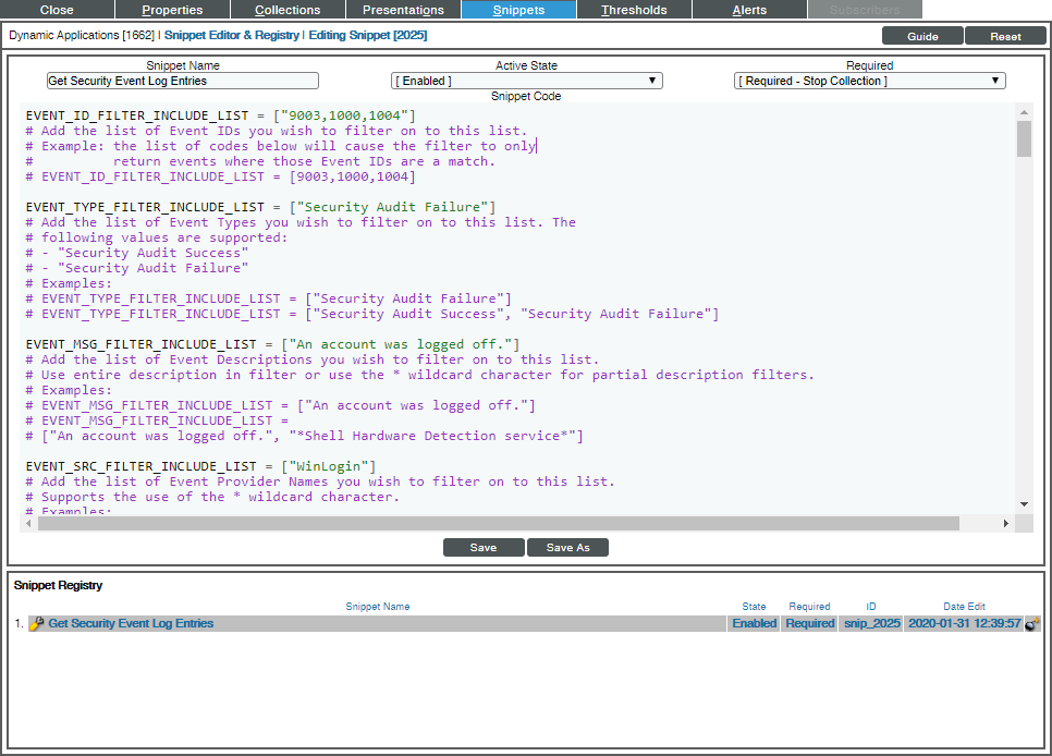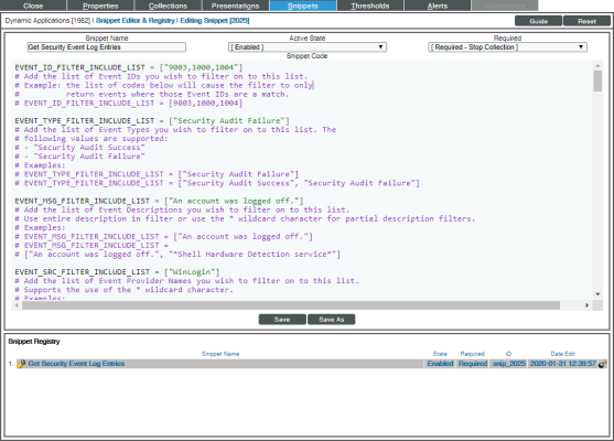The following Snippet Dynamic Applications can be used to collect data from system, application, and security event logs on Microsoft Windows servers: