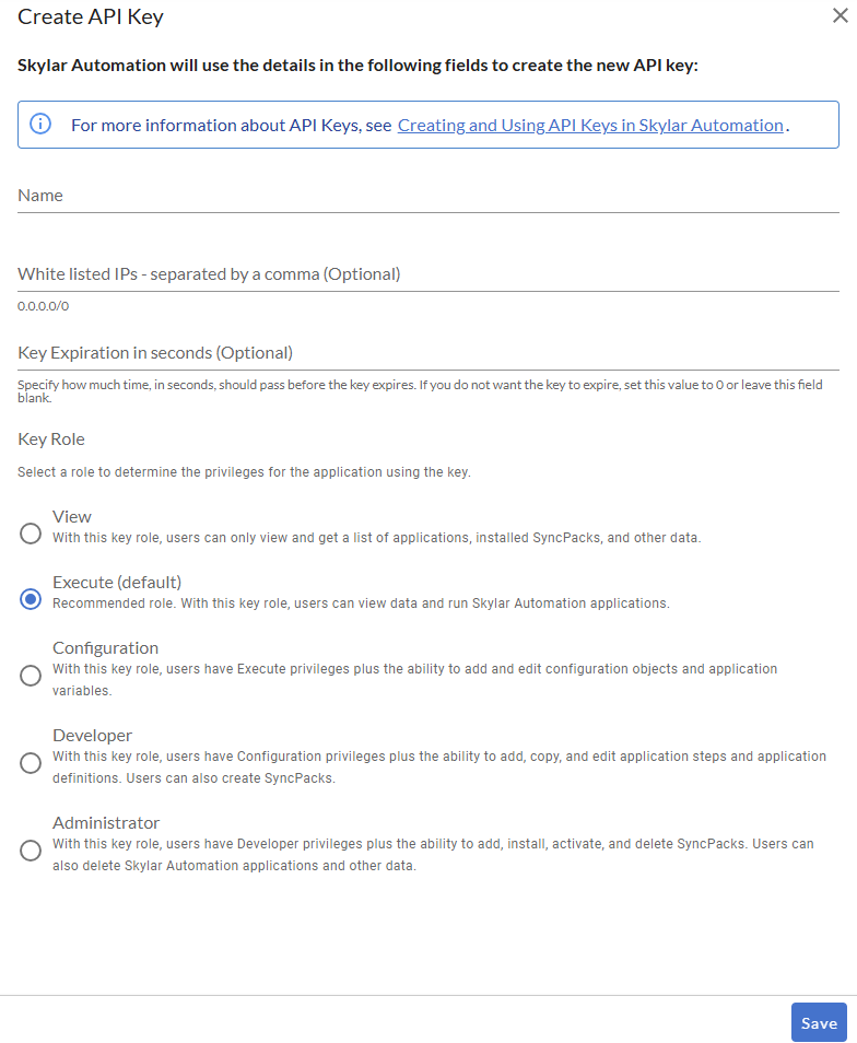 - Role.Select a user role for the API key. This role controls which resources are available to the API key in the Skylar Automation API. The default role is Execute. For more information about the different roles, see User Groups, Roles, and Permissions.
