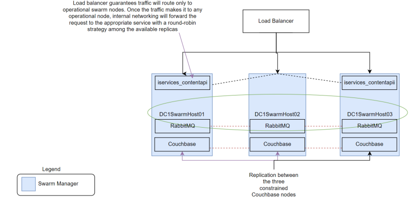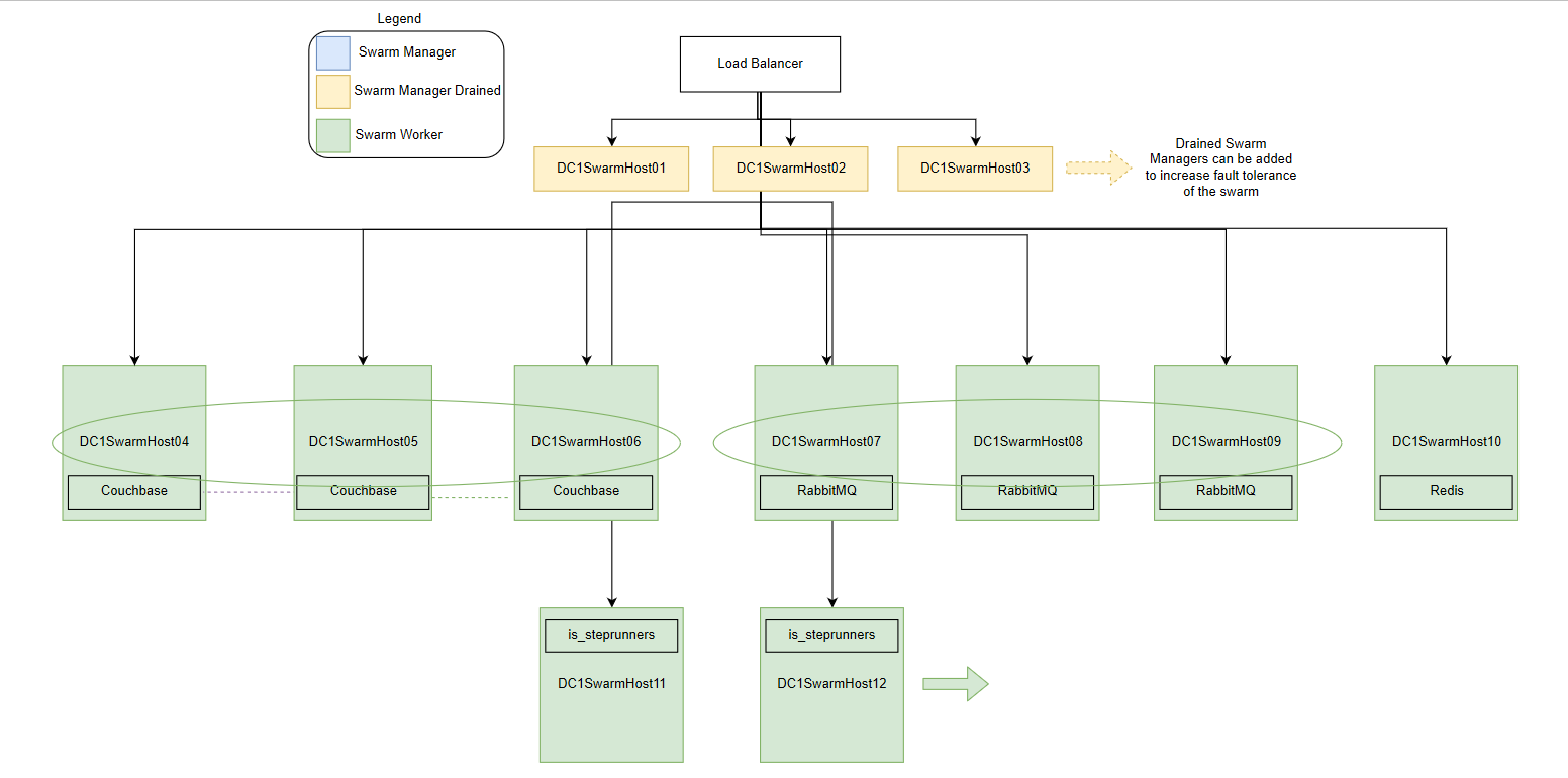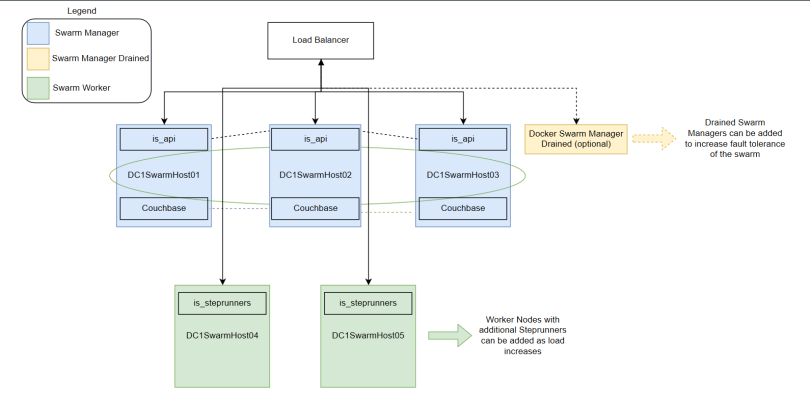 The following High Availability deployment adds Docker Swarm worker nodes where steprunners can be constrained. This lets you continue to scale out new worker nodes as the load increases. This also lets you distribute steprunners based on workloads. Core services include ContentAPI, RabbitMQ, and Couchbase.