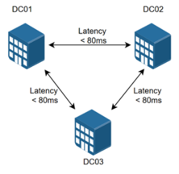 Docker Swarm requires three data centers to maintain quorum of the swarm in the event of a full data center outage. Each data center must have a low-latency connection between the data centers.