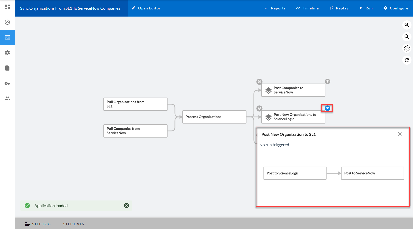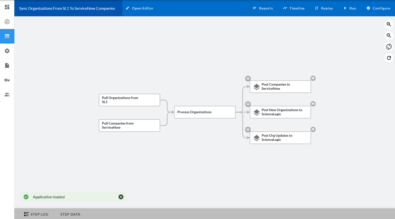 The Application detail page contains the logic for the application. In the main viewing pane, the steps for the application are organized as a flowchart. Each rectangular block is a step, and the arrows indicate the order in which the steps will execute when you run the application. The color of each step changes to show the progress of the application run as it runs: green for success, red for failure, and blue for running.