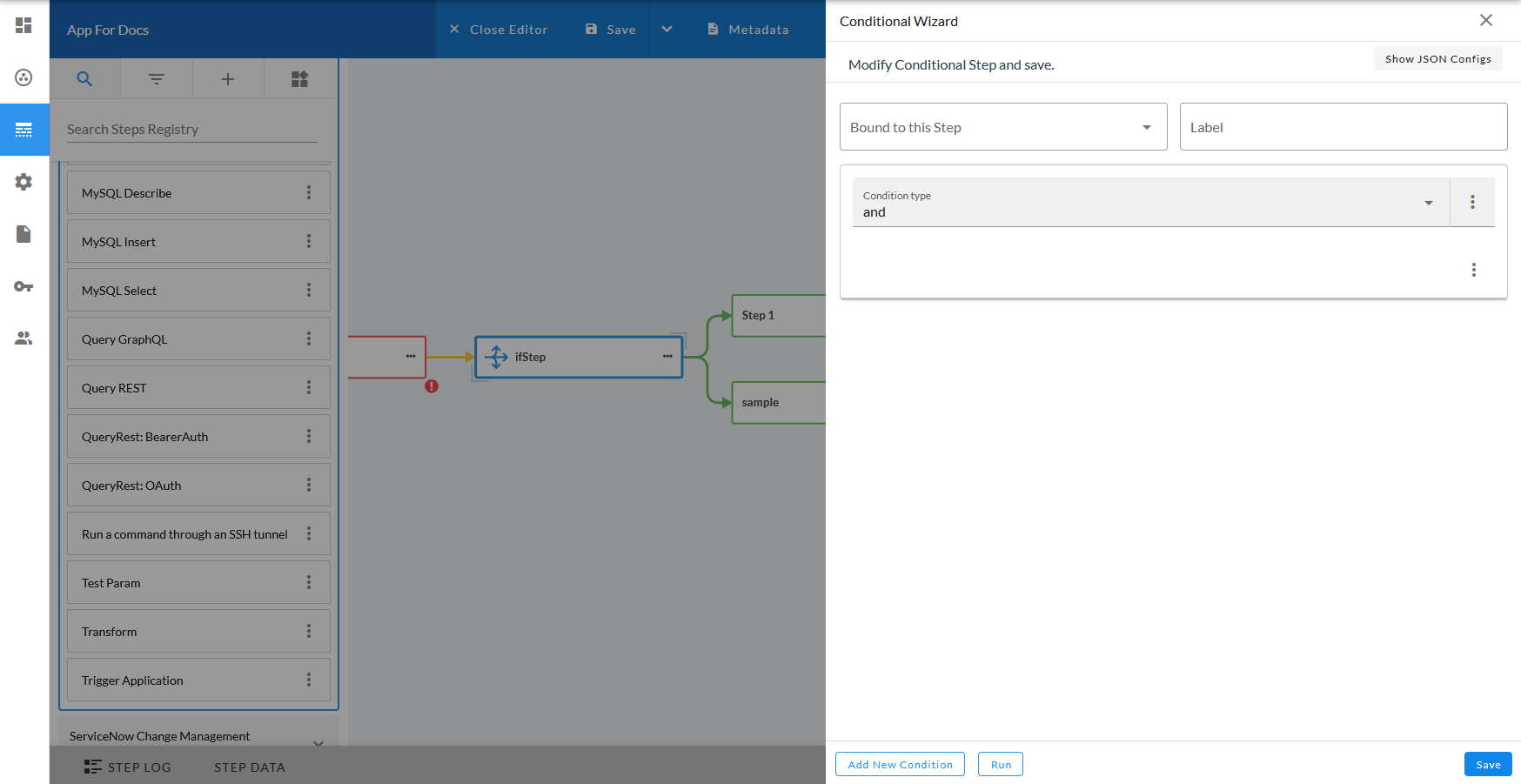 - On the Steps Registry pane, select the step you want to add and drag it to the main viewing pane ("canvas"). The Configuration pane for that step appears.