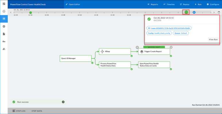 ) appears in the upper left corner of the step. Click the icon to display the triggered application's run as a link in a pop-up window, which lists the run IDs by Success, Failure, or In Progress. You can click the link in the pop-up window to view the detail page for the triggered application. If no run ID is present, the pop-up window displays "No runs available".