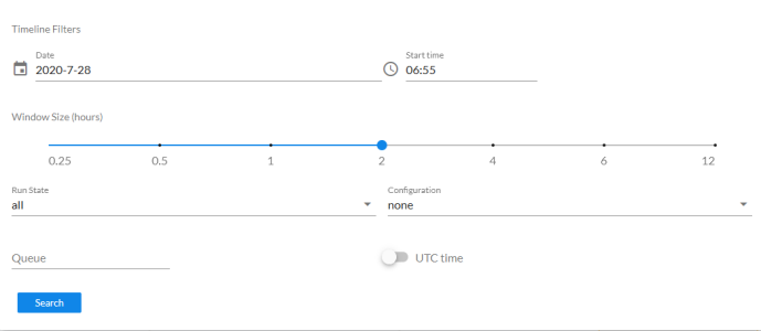 . Opens the Timeline view at the top of the window where you can view past runs of this application, and whether the application failed or succeeded. For more information, see Viewing Previous Runs of an Application.