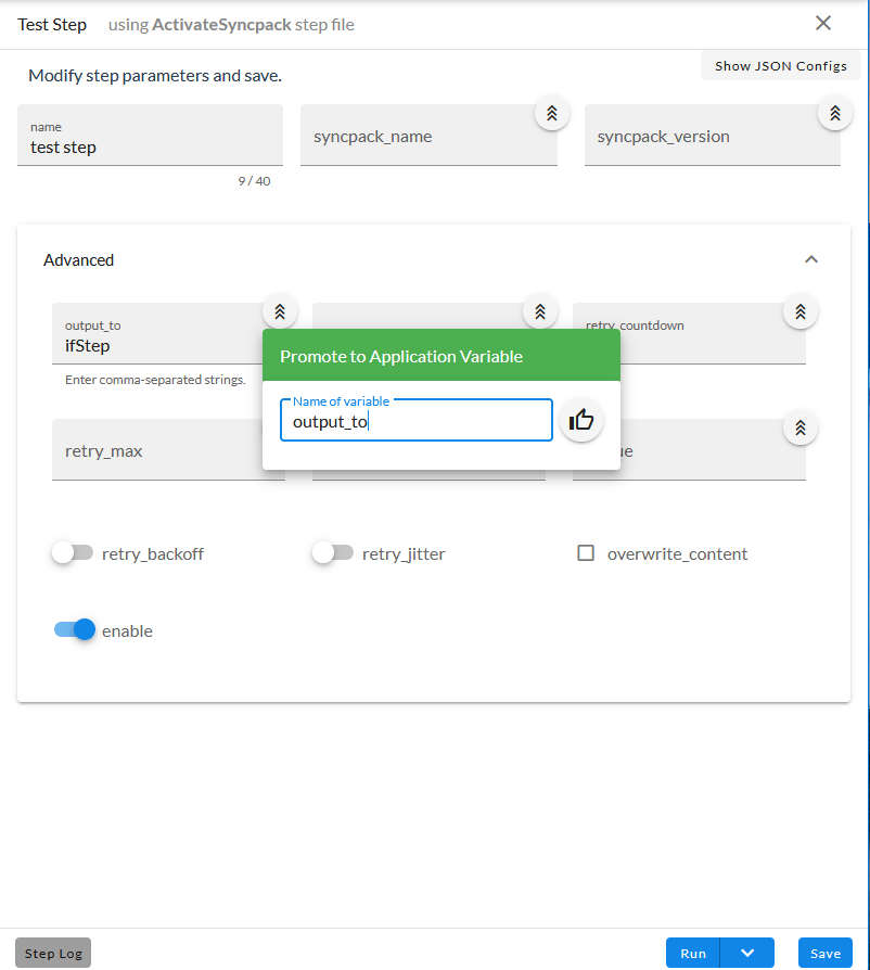 ) for the step variable you want to promote. A Promote to Application Variable modal appears. -