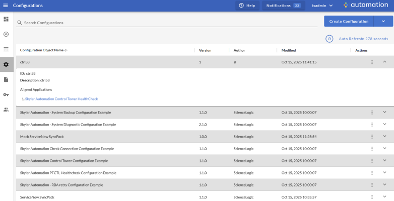 You can create and edit configuration objects on the Configurations page () of the Skylar Automation user interface. After you create the configuration object, it appears in the Configuration drop-down on the Configuration pane of an Application detail page.