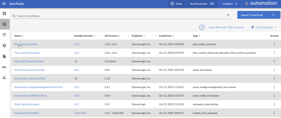 You can view the latest steps, applications, and configurations for Skylar Automation or a third-party integration, such as ServiceNow, by downloading the most recent SyncPack for that integration. You can download SyncPacks from the SyncPacks page on the ScienceLogic Support Center (Skylar Automation > SyncPacks).