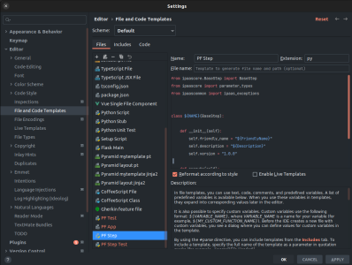 The Cookiecutter includes a zip file with three templates in /.pycharm_devcontainer/settings.zip with basic information to create a new step, application, and step test.