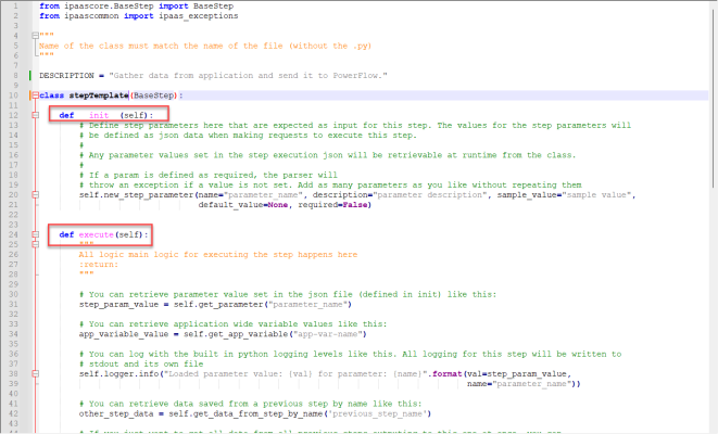 To execute successfully on Skylar Automation, your step must be a subclass of the ipaascore.BaseStep class. The ipaascore.BaseStep class is a Python class that is included with PowerFlow, and it contains multiple predefined functions that you can use when you are writing or editing a step.