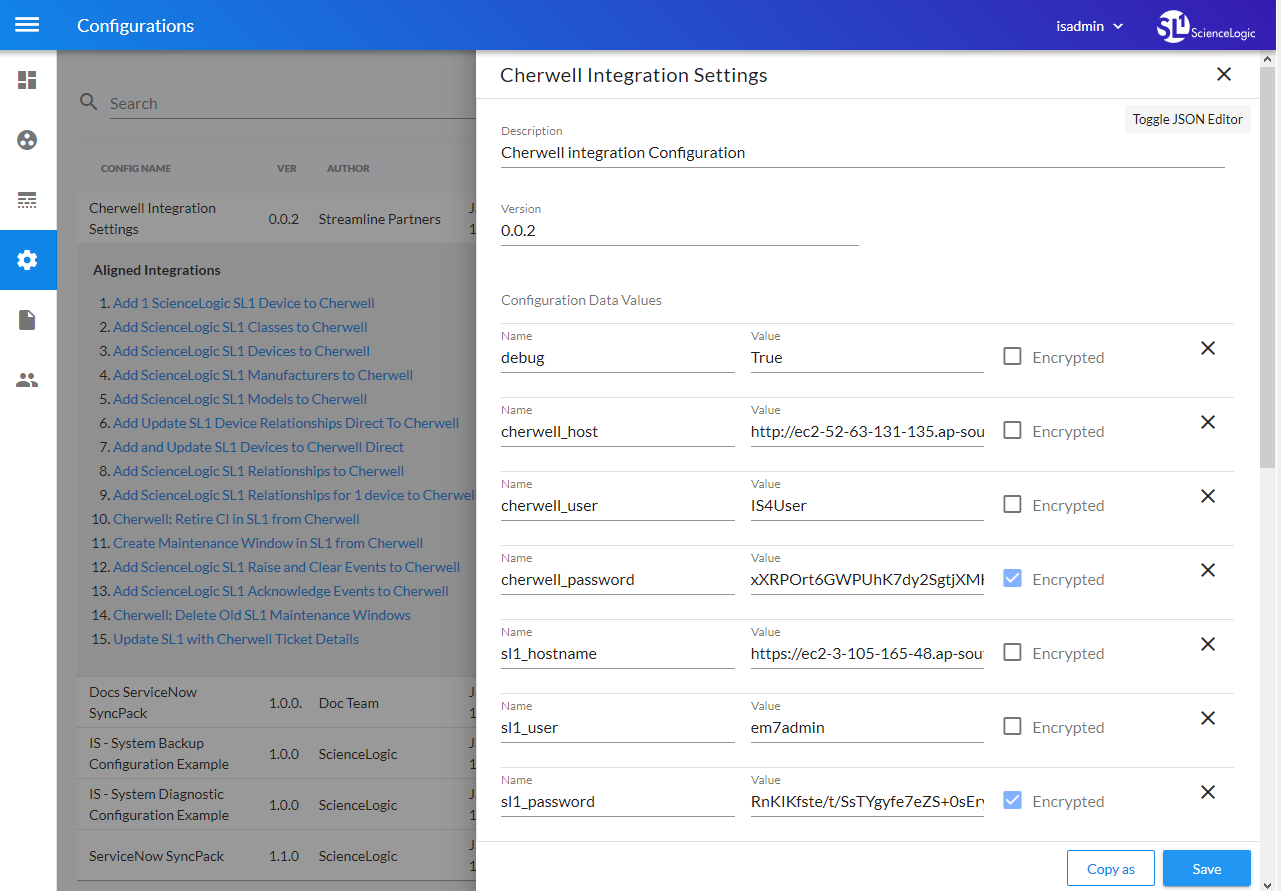 For example, you can edit the variables in the "Cherwell Integration Settings" configuration object that came with the SyncPack and then align that configuration object with one or more CSM-related applications. You can also use the button to make a copy of that configuration object so you can align it with other applications.