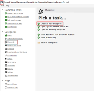 Log in to the CSM Administrator client as an administrator, select Blueprints in the Categories sub-menu on the left, and select Create a new Blueprint: