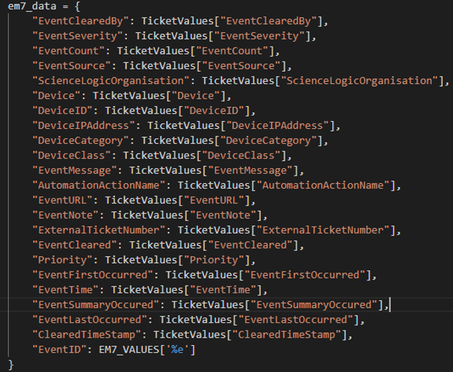 In the snippet section, update the em7_data dictionary with the key you want the value to be addressed by and the value. For example: "ClassName": EM7_VALUES[%_class_name]: