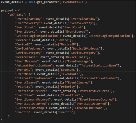 Update the payload dictionary in the step with the key and value you added. For example: "ClassName": event_details["ClassName"]