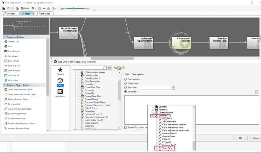 From the variable selector, scroll down to the Variables drop-down and select EventData as this is the variable we assigned to the payload in the "Setup Event to Incident JSON Data" step: