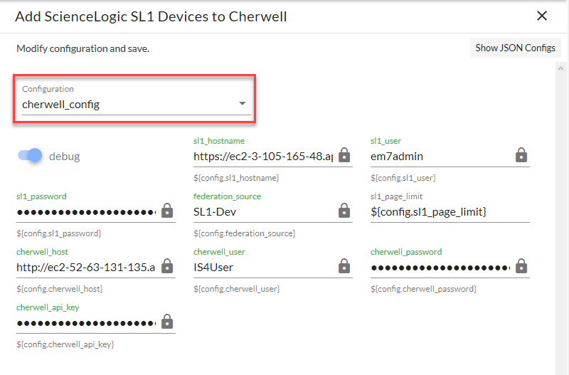 The following configuration object variables are required for the "Cherwell" SyncPack: