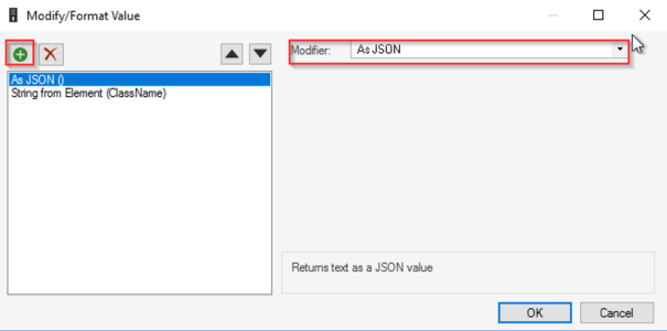 - Click again, select String from Element from the Modifier drop-down, and type the name of the key for the new value you put in the dictionary in step 4, such as ClassName.