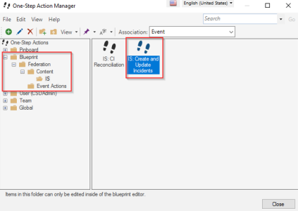 Navigate to the "Blueprint/Federation/Content/IS" folder, right-click the "IS: Create and Update Incidents" One-Step file, and select Edit. The One-Step Editor page appears: