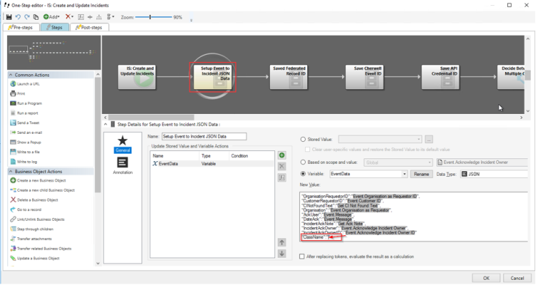 - Select the "Setup Event to Incident JSON Data" step so you can append the value you added to the dictionary in step 4 as a key-value pair at the end of the dictionary on this step. For example: "ClassName": event_details["ClassName"]