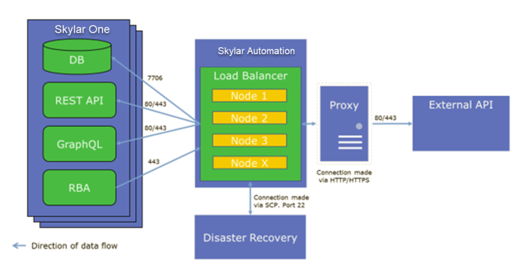 The following diagram provides an example of the high-level architecture of a Skylar Automation system with High Availability, Disaster Recovery, and a proxy configured: