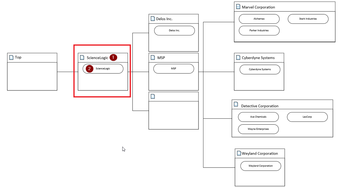 In the following example, ScienceLogic (1) is both the domain and the company. The ScienceLogic user service account is associated with ScienceLogic (2) company, and it will have access to all child domains. You do not need to set visibility to any domain. This is the best way to set up this user, because placing it in the top domain ensures that it always has access to all children: