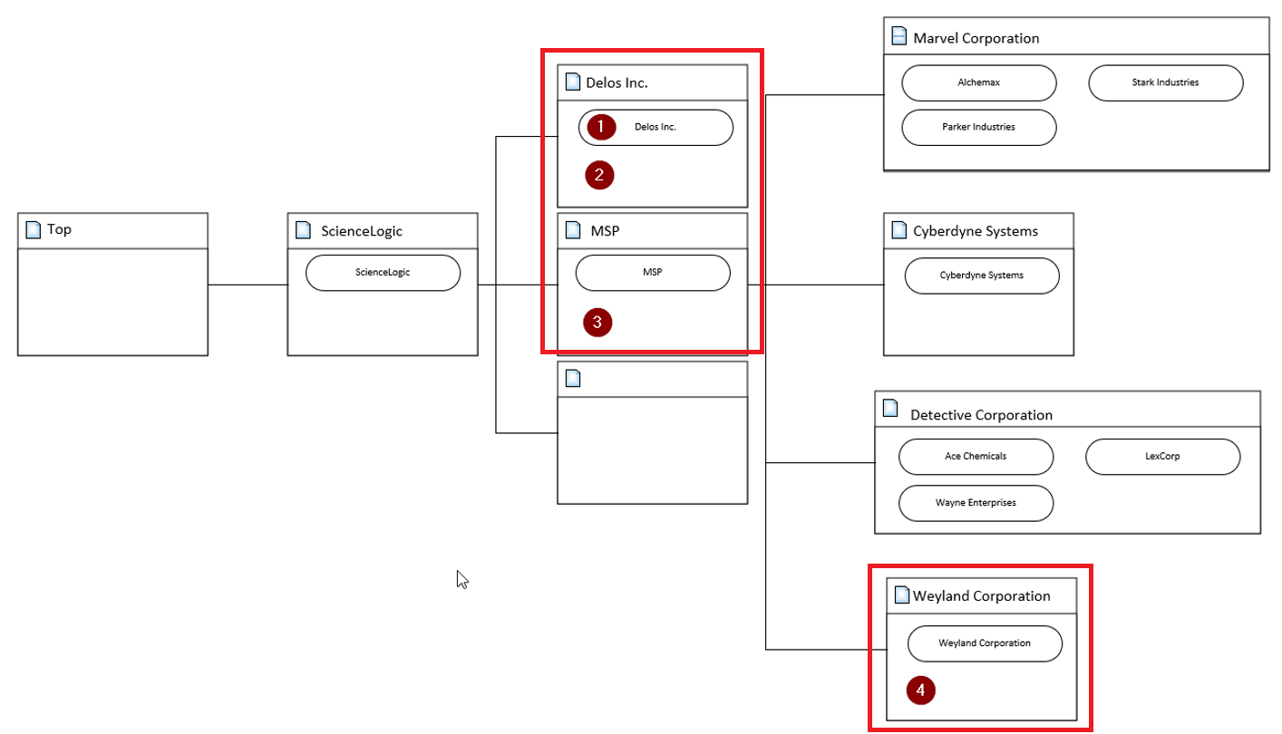 Assigning visibility to MSP (3) will grant the service account access to all child domains. Assigning visibility to Weyland Corporation (4) will only allow access to the Delos Inc. domain and the Weyland domain; all other domains will not work.