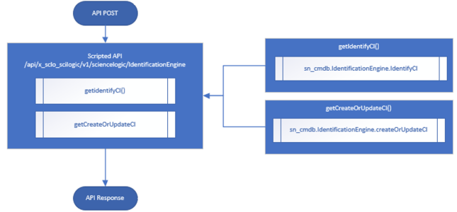 The API endpoint is based on the API query parameter “test” being true or not, which determines which Identification Engine API resource should be used. There are two primary avenues supplied with this REST resource: "createOrUpdateCI" or "identifyCI", and the only difference is that "identifyCI" does not commit the results: