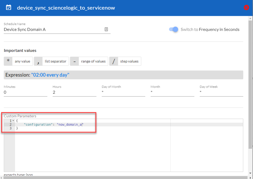 The following image shows how you can create a schedule that uses a specific configuration object using the Custom Parameters field in the Skylar Automation Scheduler: