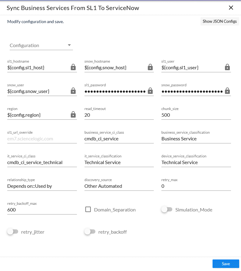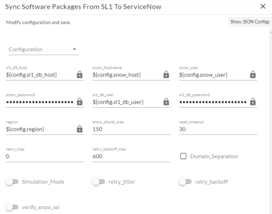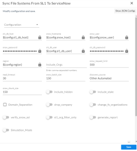 - sl1_chunk_size. Specify the number of services to include in each chunk sent to ServiceNow when you run this application. The default chunk size is 500.