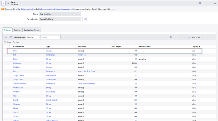 The following image shows the Location table, and the Display column shows the Name marked as true. Only one field on the table can be marked as true, and that is the field that will be returned to Skylar Automation :