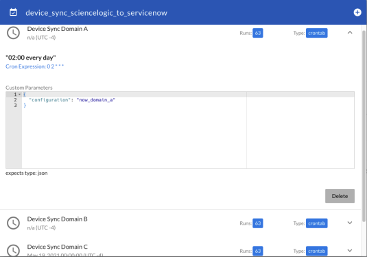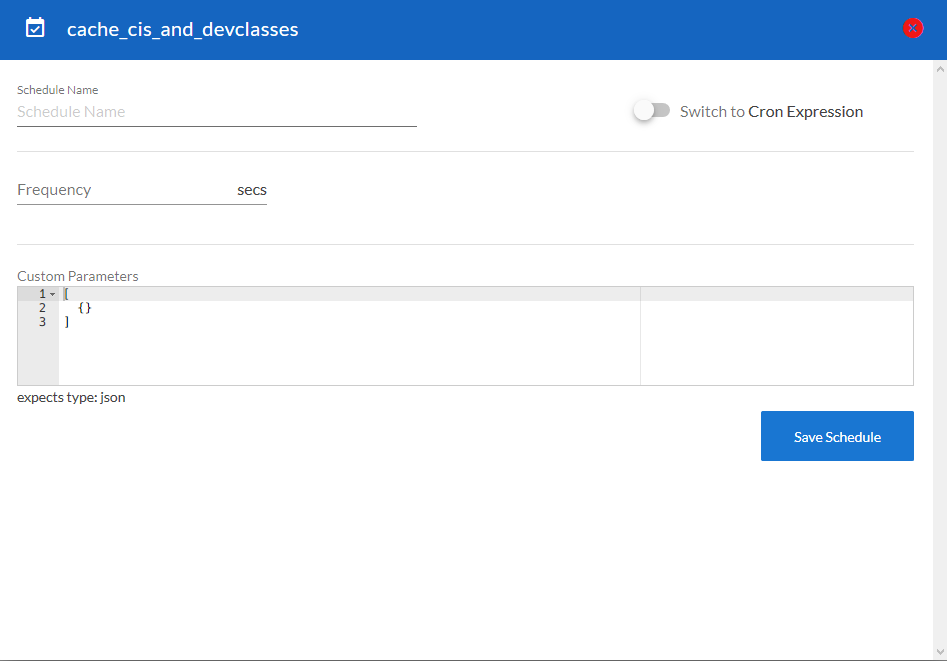 - Custom Parameters. Type any JSON parameters you want to use for this schedule, such as information about a configuration file or mappings. The values in this field will override any application variables that exist in the PowerFlow application you are scheduling.