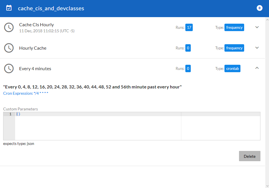 If you set up a schedule using a cron expression, the details of that schedule display in a more readable format in this list. For example, if you set up a cron expression of */4 * * * *, the schedule on this window includes the cron expression along with an explanation of that expression: "Every 0, 4, 8, 12, 16, 20, 24, 28, 32, 36, 40, 44, 48, 52, and 56th minute past every hour".