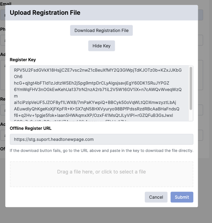 - Navigate back to your Skylar Compliance system and drag the file to the Upload Registration File pane to upload it or click inside the pane to select the file.