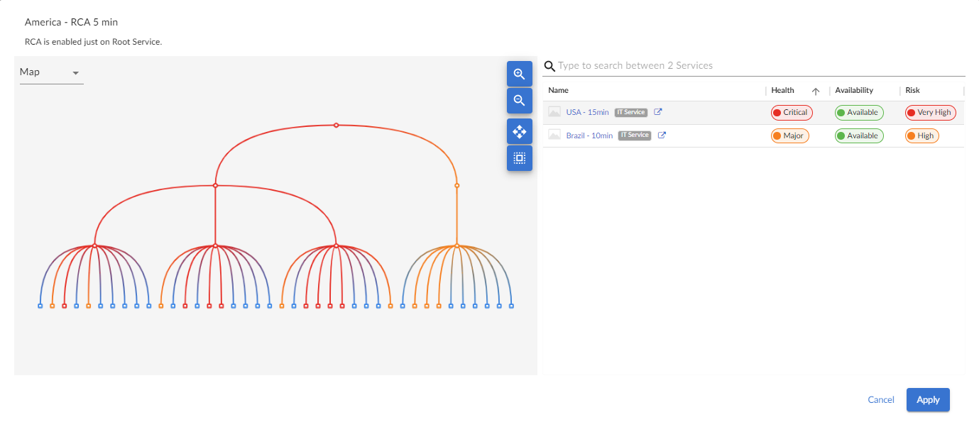 • The map view displays a map of the service and any constituent services and devices that belong to that top-level service.