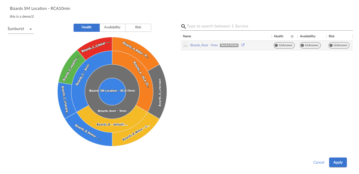 By default, the sunburst displays the health value for the selected service and its constituent services or devices. To view the current availability or risk value for the selected service, click either the Availability or Risk tab above the sunburst chart.