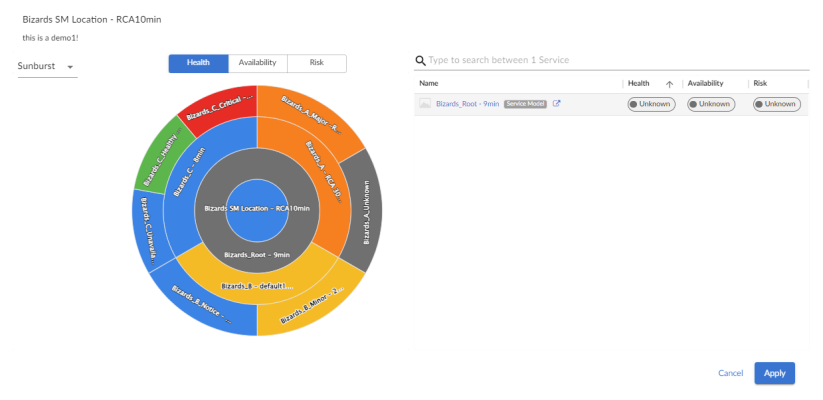 You can click the sunburst chart to see a more detailed breakdown of the Health, Availability, and Risk statuses of your services. Doing so will open a larger modal that provides different ways to view and filter the statuses of your devices on this particular service.
