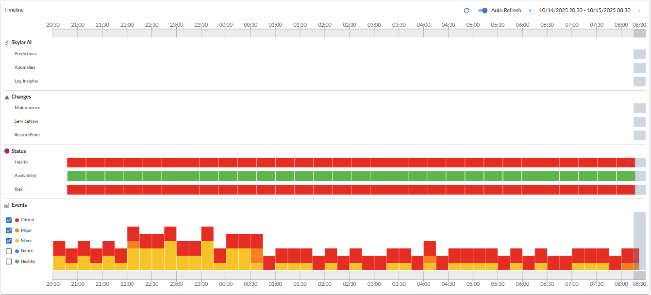 • Timeline. A panel that displays swim lanes and bar graphs to show Historical, Change, Health, Availability, Risk, and Skylar Automated RCA events. Swim lanes are visual flowcharts that show a process from start to finish for an event.