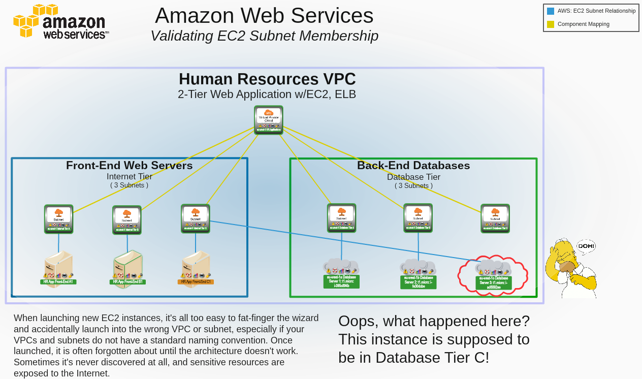 In this example, the circled EC2 instance was accidentally launched into the wrong subnet. It was supposed to be launched into the "Database Tier 3" subnet, but it was launched into "Internet Tier 3" instead, exposing the database server.