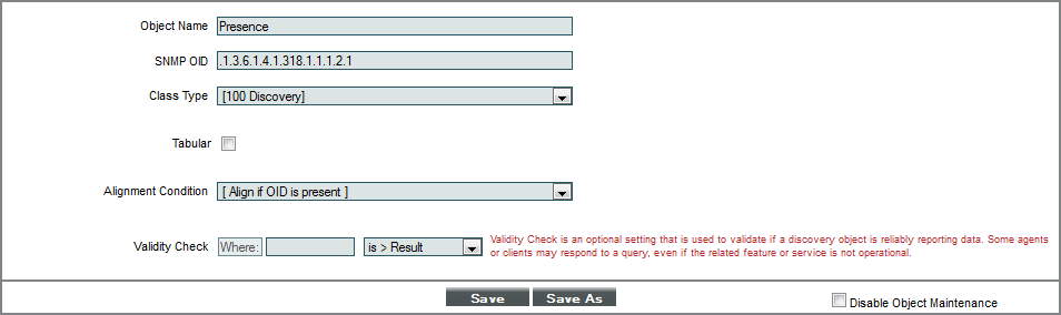 • Align if OID is present. Specifies that if the device returns a value for the discovery object, evaluate to true. Optionally, in the Validity Check field you can specify the criteria that the returned value must meet.