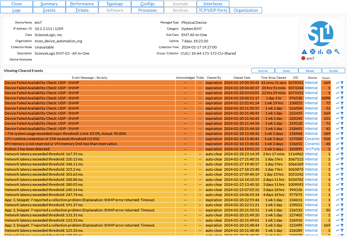 You can view cleared events from a Dynamic Application from the Viewing Cleared Events page. A cleared event is an event that is no longer occurring, and has been manually cleared by a user, or has expired.
