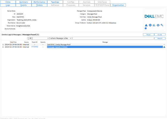 You can view alerts generated by a Dynamic Application in the Device Logs & Messages page. To view alerts on a device generated by a Dynamic Application: