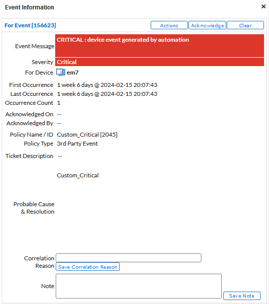 - Acknowledged On. Date and time the event was acknowledged.