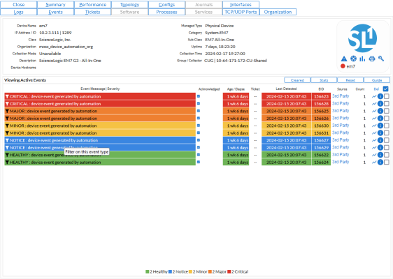 Events are messages that are triggered when a specific condition is met. For example, an event can signal that a server has gone down, that a device's hard drives are getting too full, or simply display the status of a device. You can view events generated by Dynamic Applications in the Viewing Events page. You can view active events, as well as events that have been cleared.