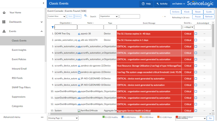 The Events page displays a list of currently active events, from critical to healthy. From this tab you can acknowledge, clear, and view more information about an event. You can also view events by organization to focus on only the events that are relevant to you. For more information about using the Events page, see the section on Viewing the List of Events.