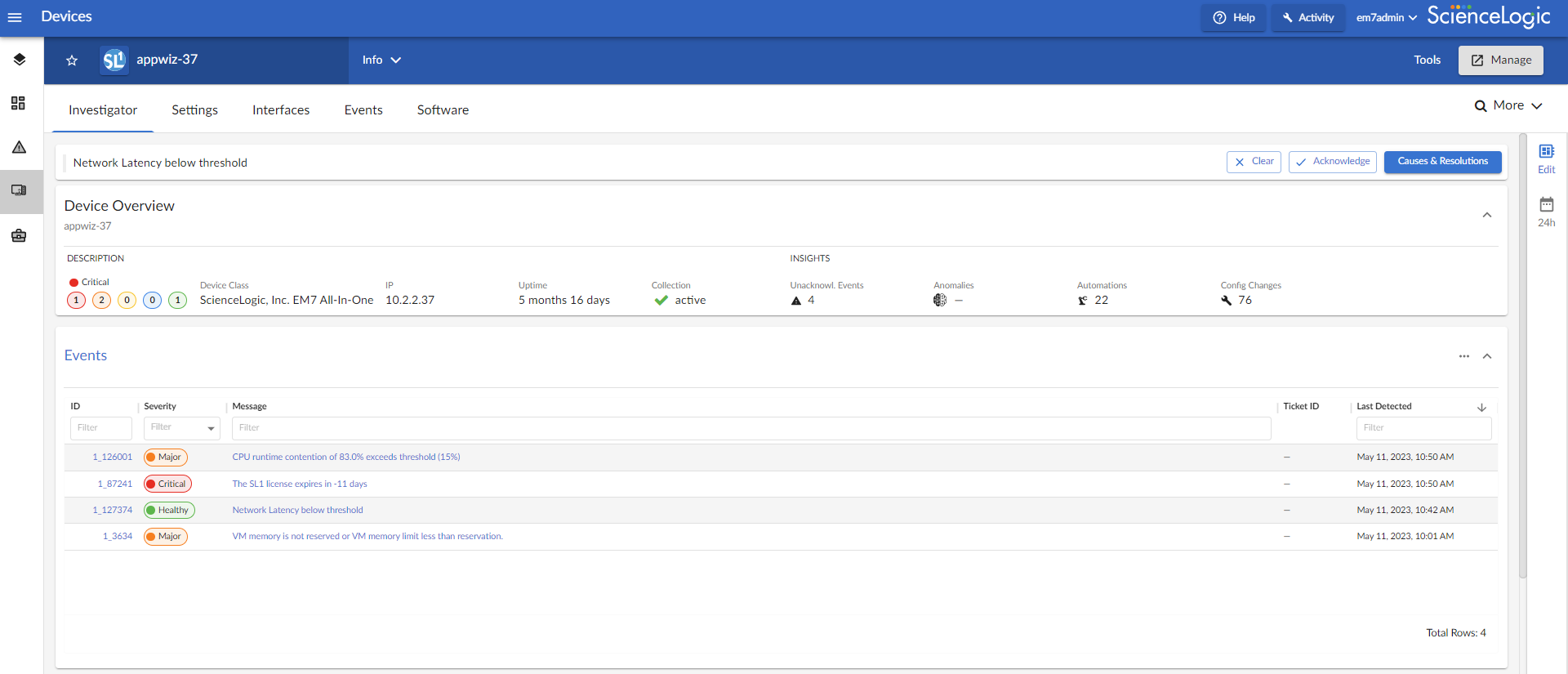 • Events. Displays a list of active and cleared events for the device. You can acknowledge events from this tab or add event notes.