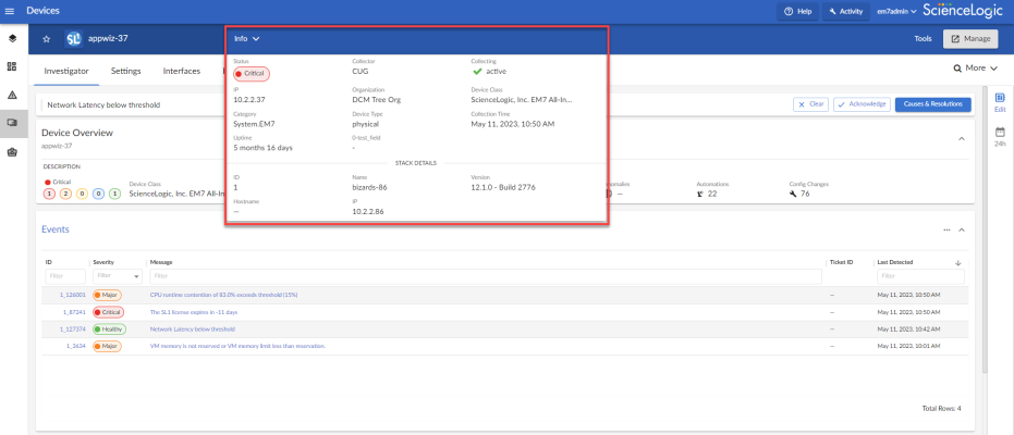 • Info. This drawer on the Investigator tab displays additional information about the device, along with the most recently updated values for uptime and collection time.