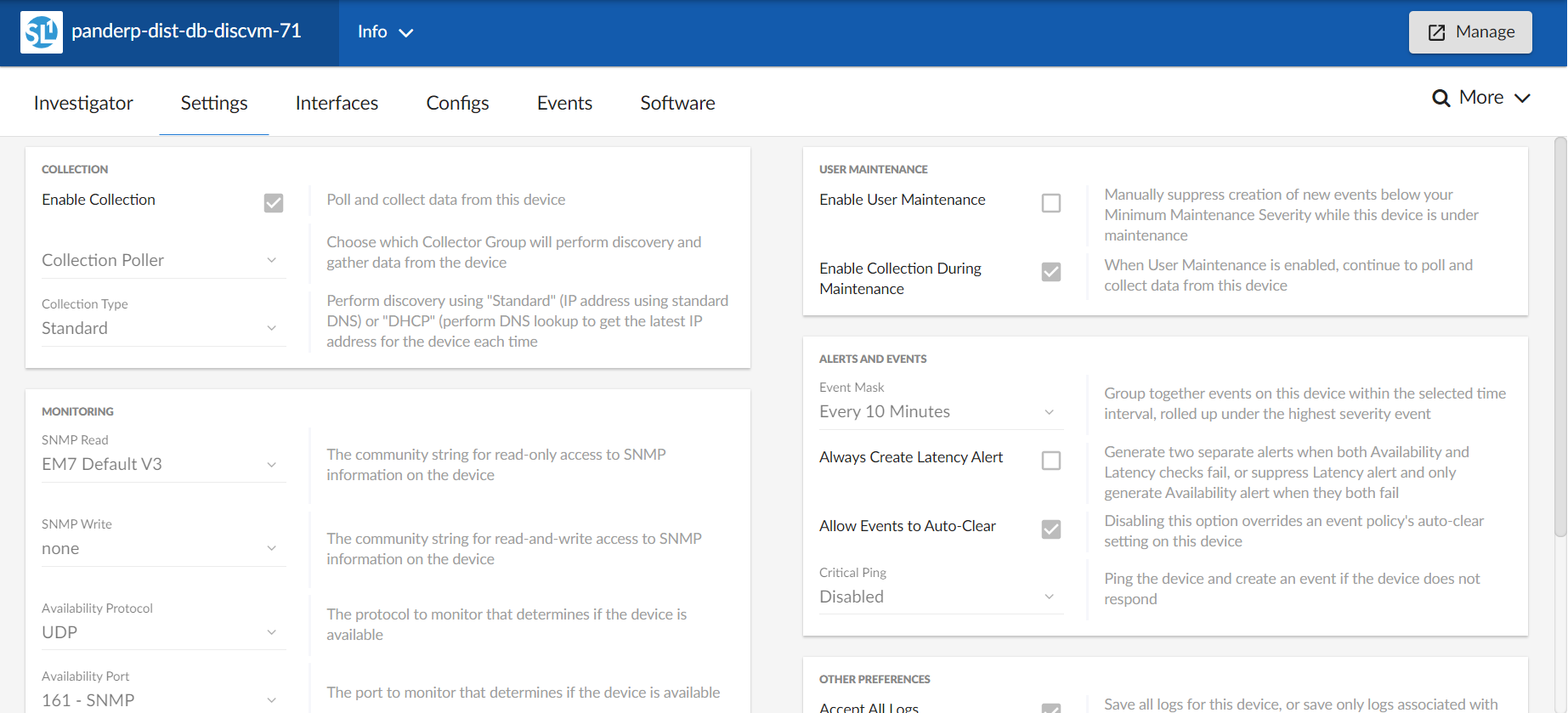 • Settings. Enables you to manage your preferences for that device, such as whether to auto-clear events, accept all logs, run daily port scans, and more. You can also set user maintenance preferences and disable or enable collection on that device.