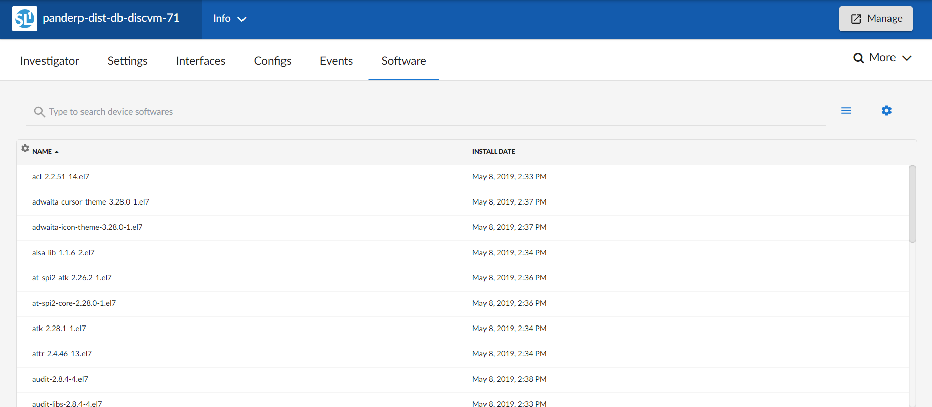 The Software tab of the Device Investigator page